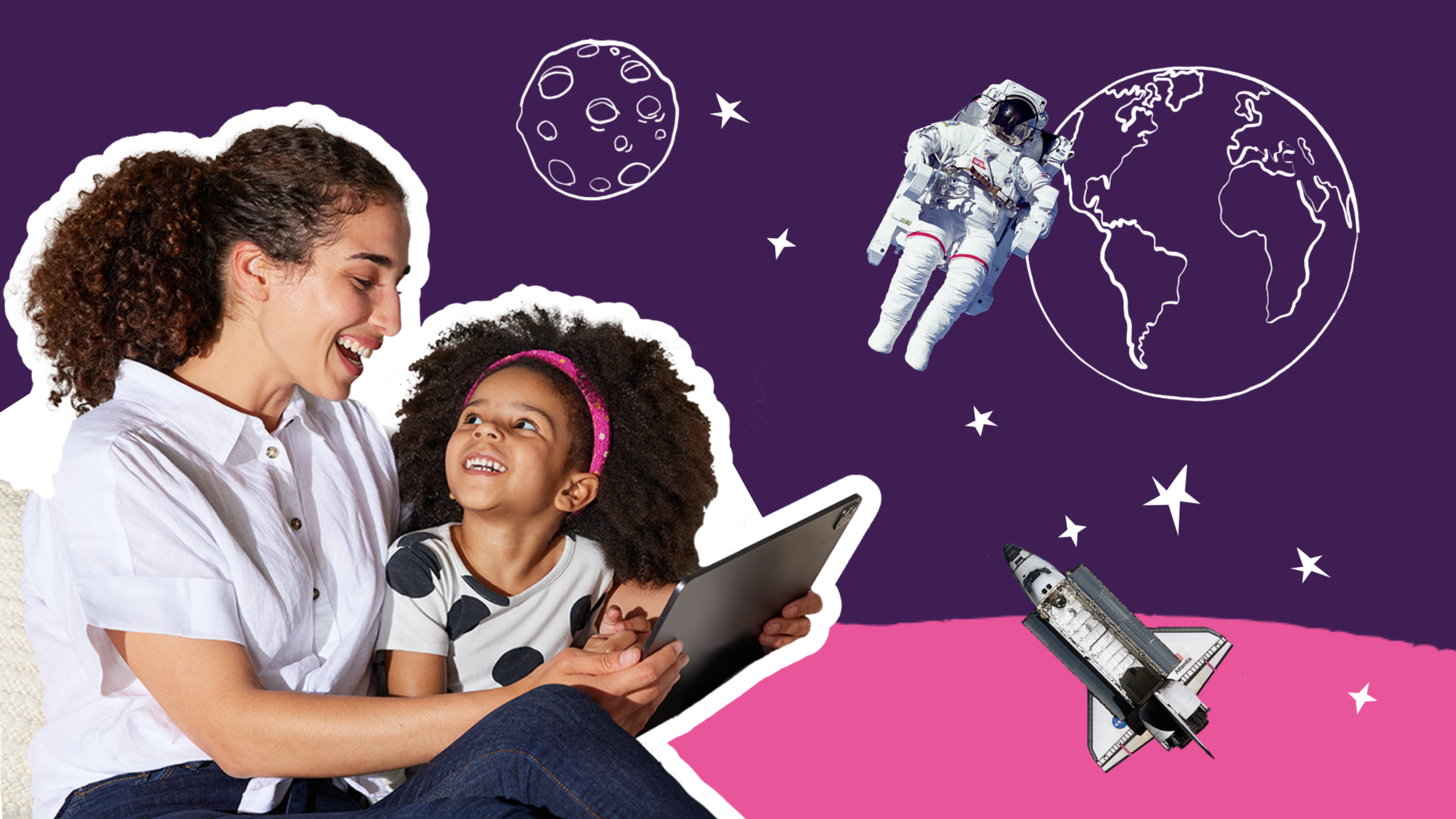 • Parent and child smiling while reading on a tablet together, supporting reading comprehension for kids and active reading strategies